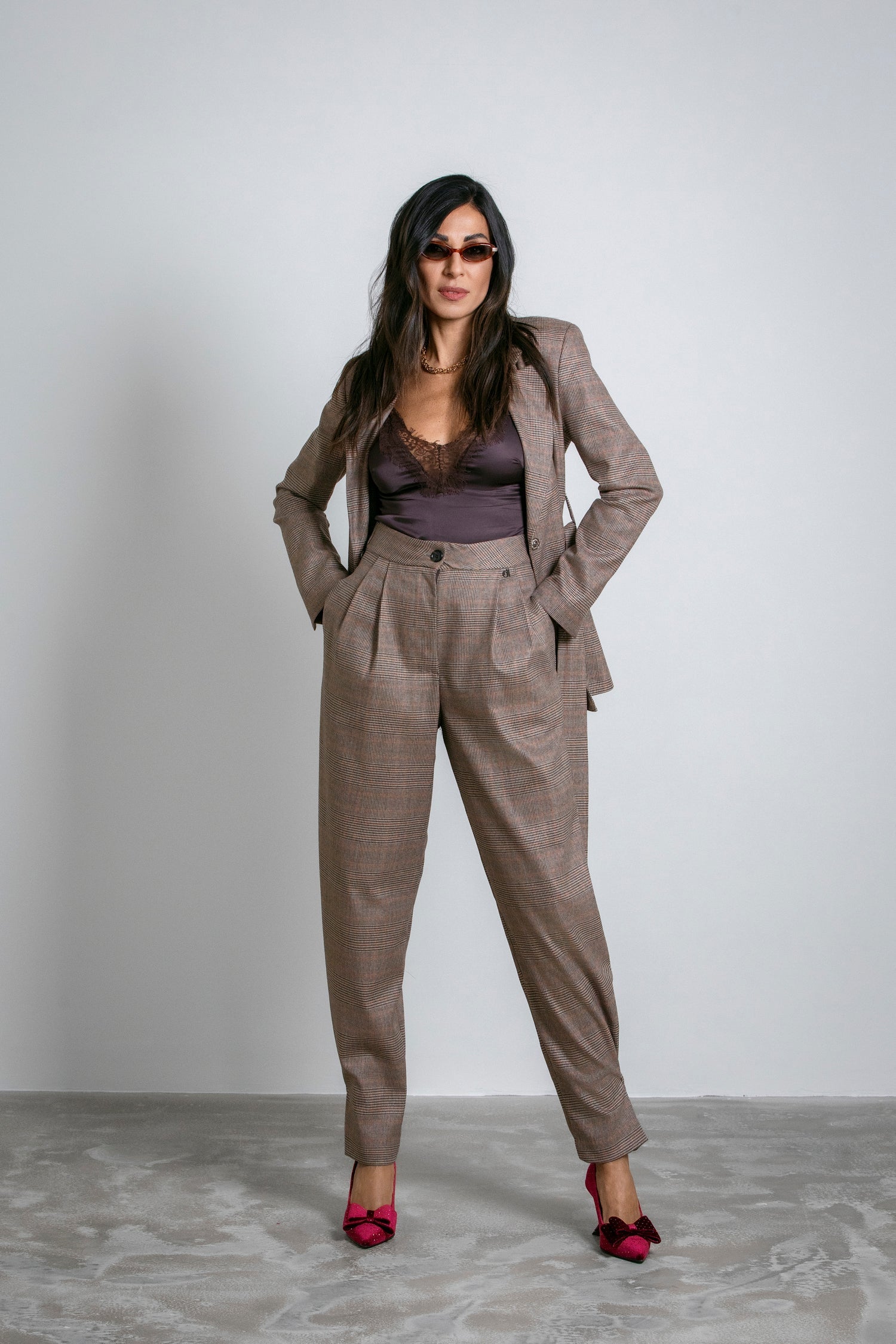 Avvolgiti in uno stile femminile con questo bundle che include l'elegante eco-fur corta con maxi revers, i trousers a quadri a vita alta con pinces e i decolletè Fiocco Strass. Perfetti per distinguersi con dettagli ricercati e versatili da indossare sia al lavoro che nel tempo libero. Dai un tocco di originalità al tuo look quotidiano con il taglio dritto e comodo della eco-fur, le linee morbide e la fantasia a quadri dei trousers, e il tocco di eleganza dei decolletè con Fiocco Strass. Semplicemente irresistibili.