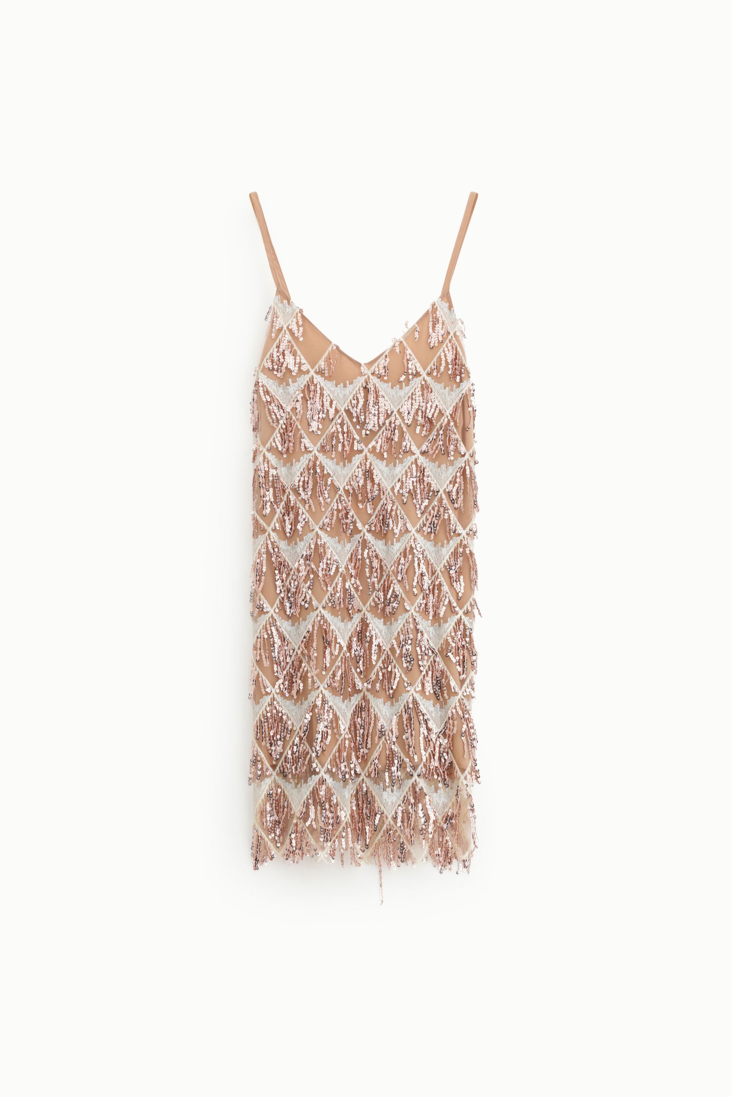 Lasciati sorprendere dall’effetto delle paillettes disposte a rombi e dalle frange che si muovono ad ogni passo. Il taglio corto e le spalline sottili danno un tocco fresco e pratico, ideale per serate tra amiche o occasioni speciali dove vuoi brillare con originalità. Perfetto per chi cerca uno stile femminile ma deciso.