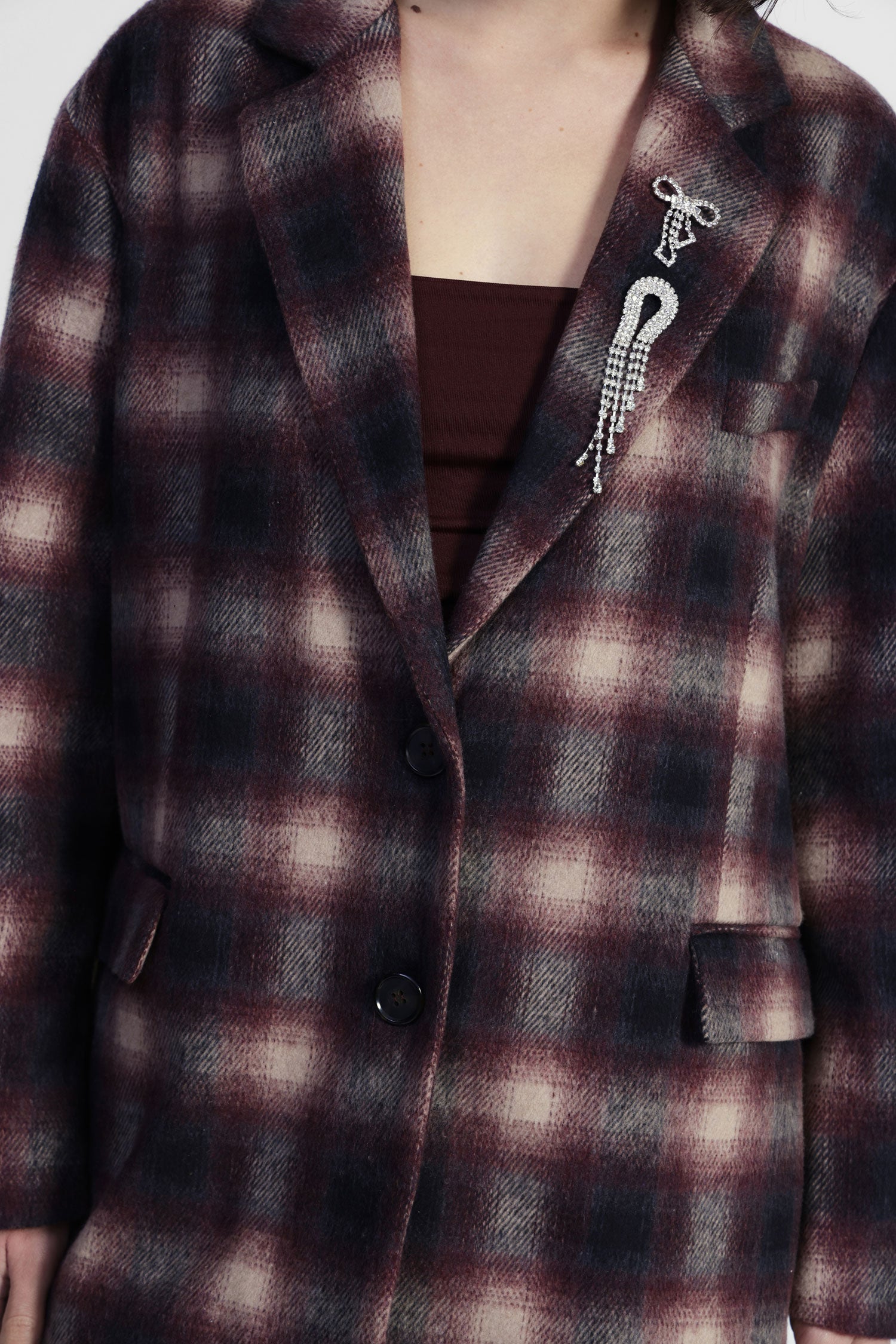 Blazer a quadri con spilla decorativa e tasche