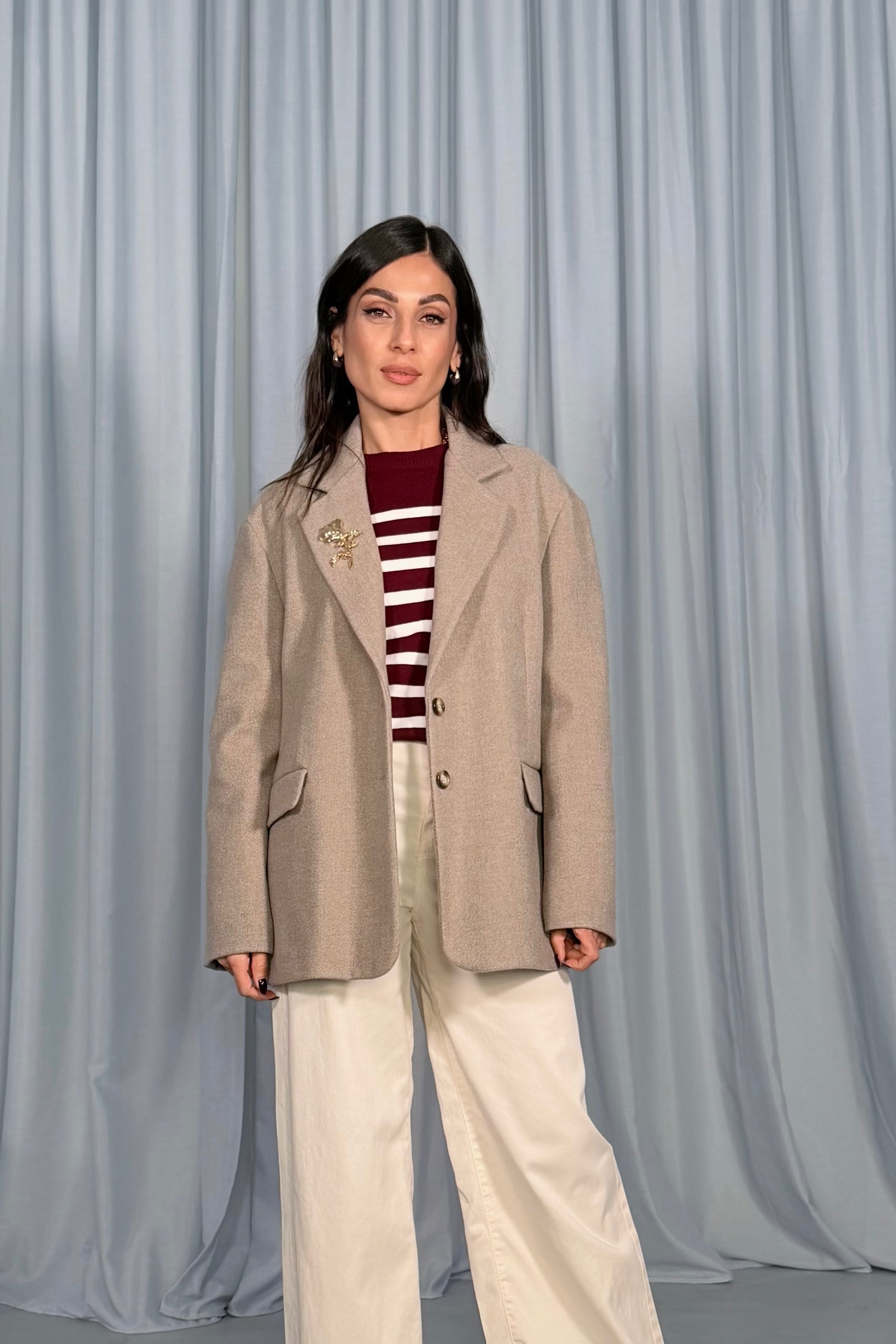Un blazer dal taglio morbido che aggiunge un tocco originale ogni giorno grazie alla spilla floreale decorativa sul revers. Si distingue per la chiusura doppiopetto e le tasche frontali con patta, perfette per chi cerca stile e praticità anche nelle giornate più movimentate.