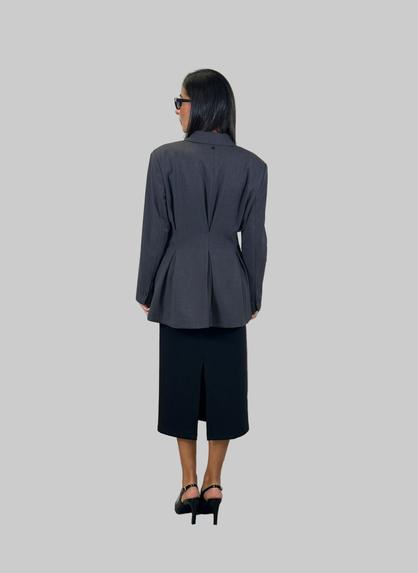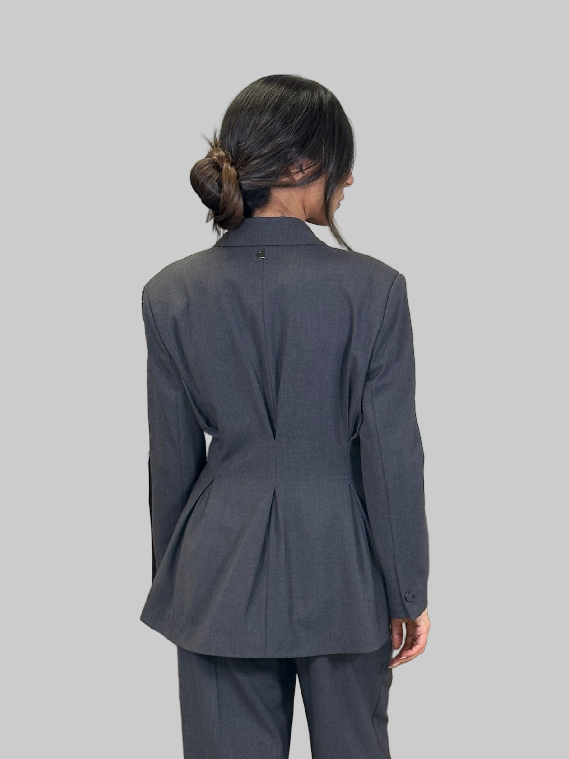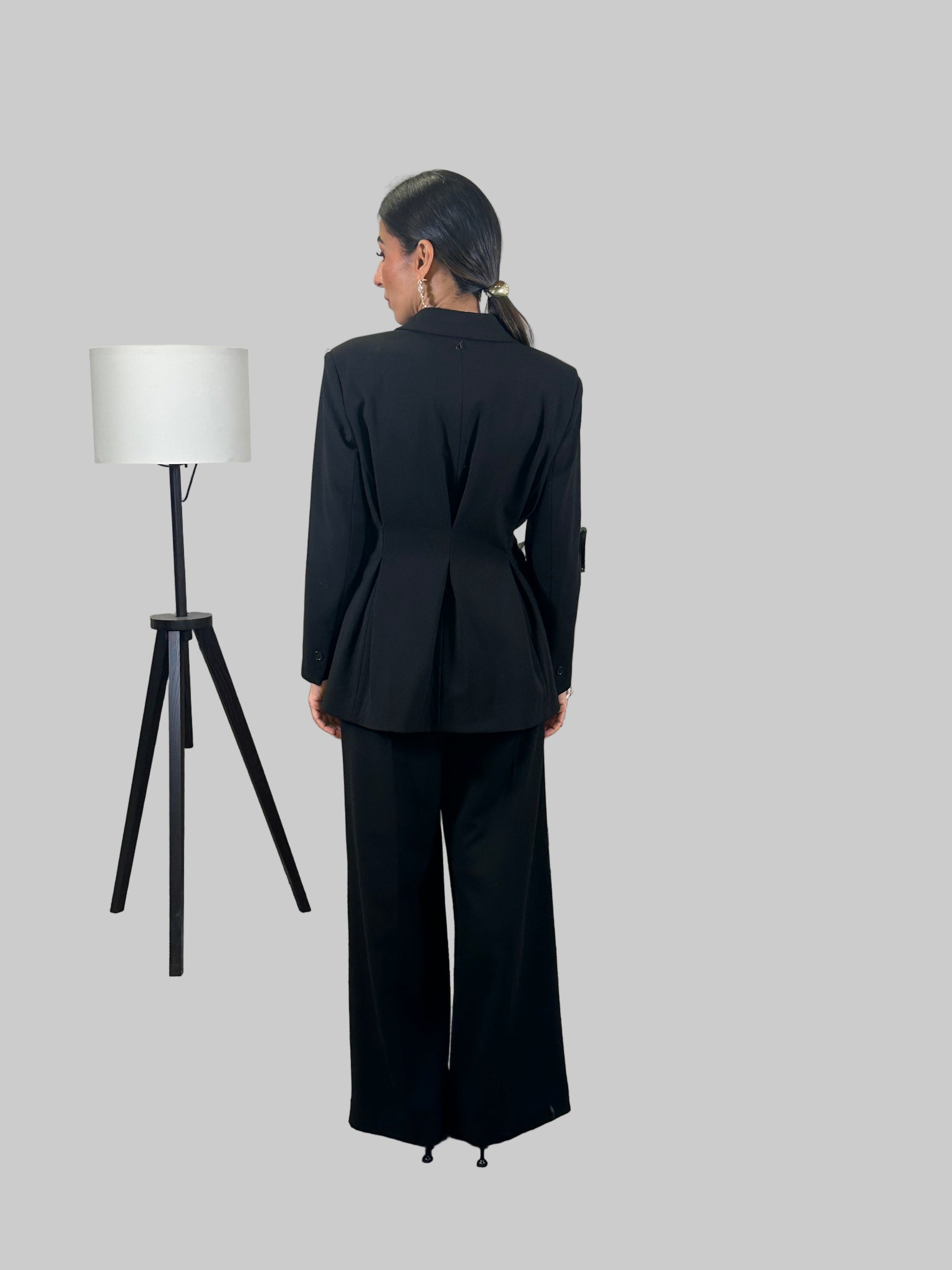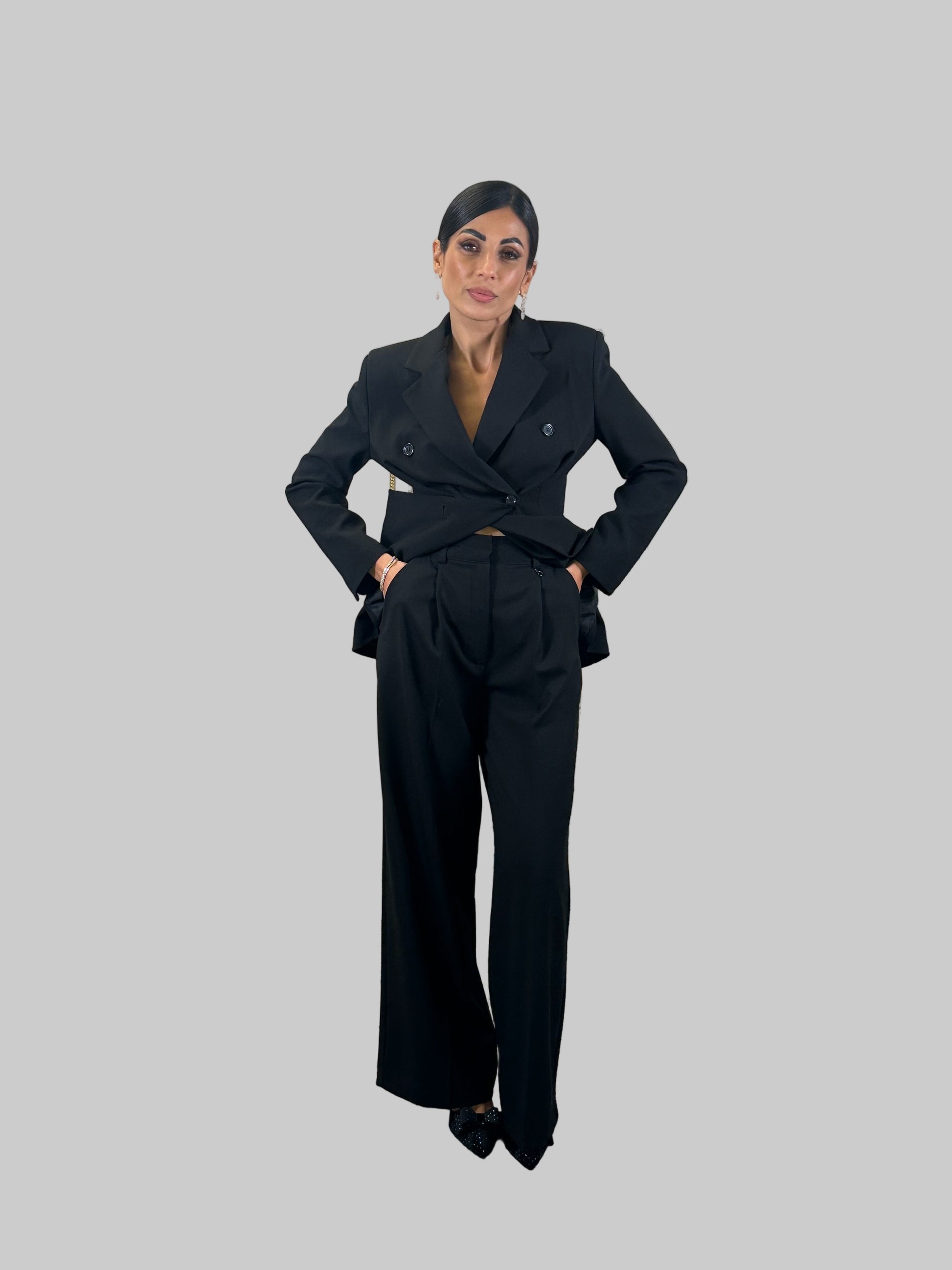 Questo blazer doppio petto presenta una silhouette elegante, arricchita da spalline strutturate e pences posteriori per una vestibilità perfetta. Ideale per un look formale, garantendo un tocco di stile e professionalità. Realizzato con tessuti di alta qualità per una vestibilità confortevole e duratura.